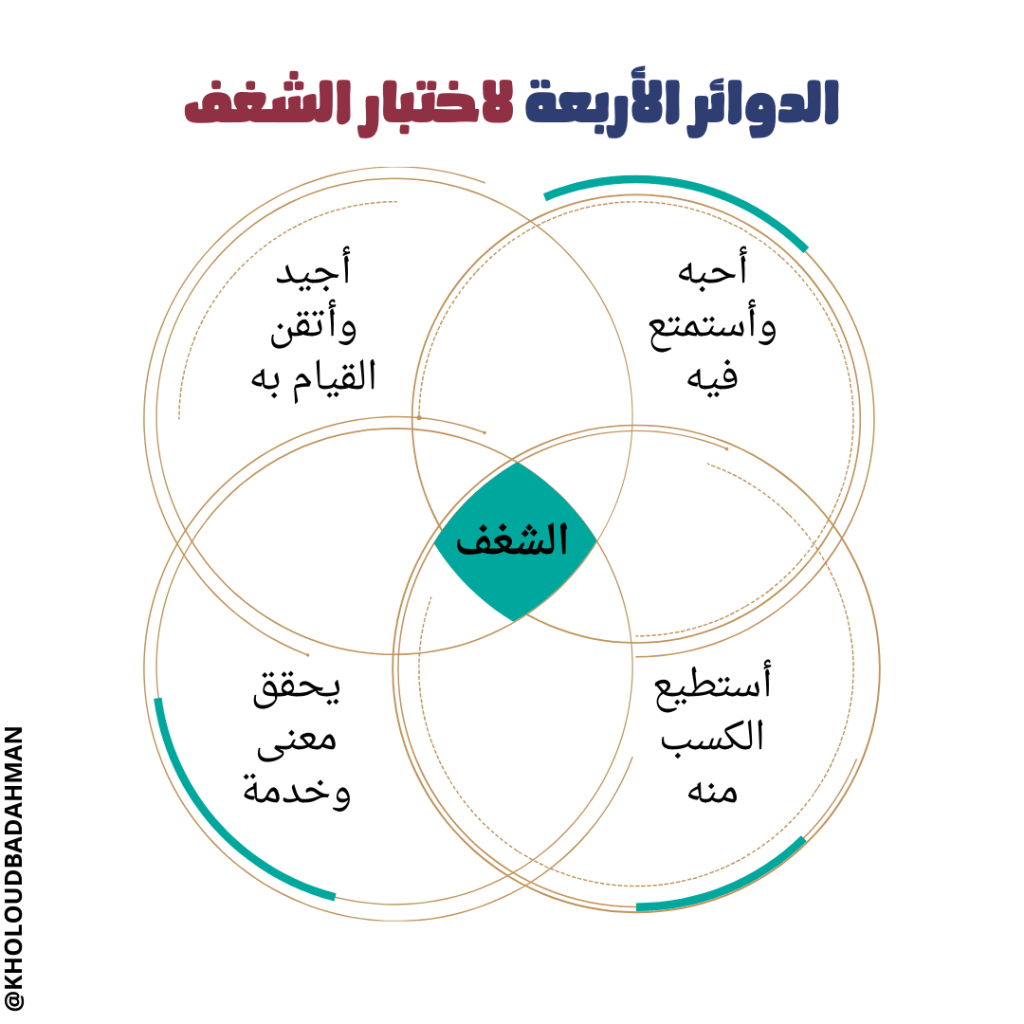 هناك أربعة دوائر مهمة يجب أن يلتقي فيها الشغف : ( ما تحبه وتستمتع فيه ، ما تجيد وتتقن القيام به ، ما تستطيع الكسب منه ، ما يحقق معنى وخدمة للناس )